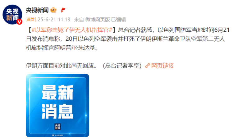 总台记者获悉,以色列国防军当地时间6月21日发布消息称,20日以色列空军袭击并打死了伊朗伊斯兰革命卫队空军第二无人机旅指挥官阿明普尔·朱达基。