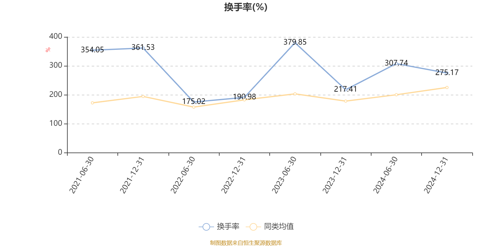 截至2024年12月31日,基金最近一年换手率约590.95%,持续高于同类均值。