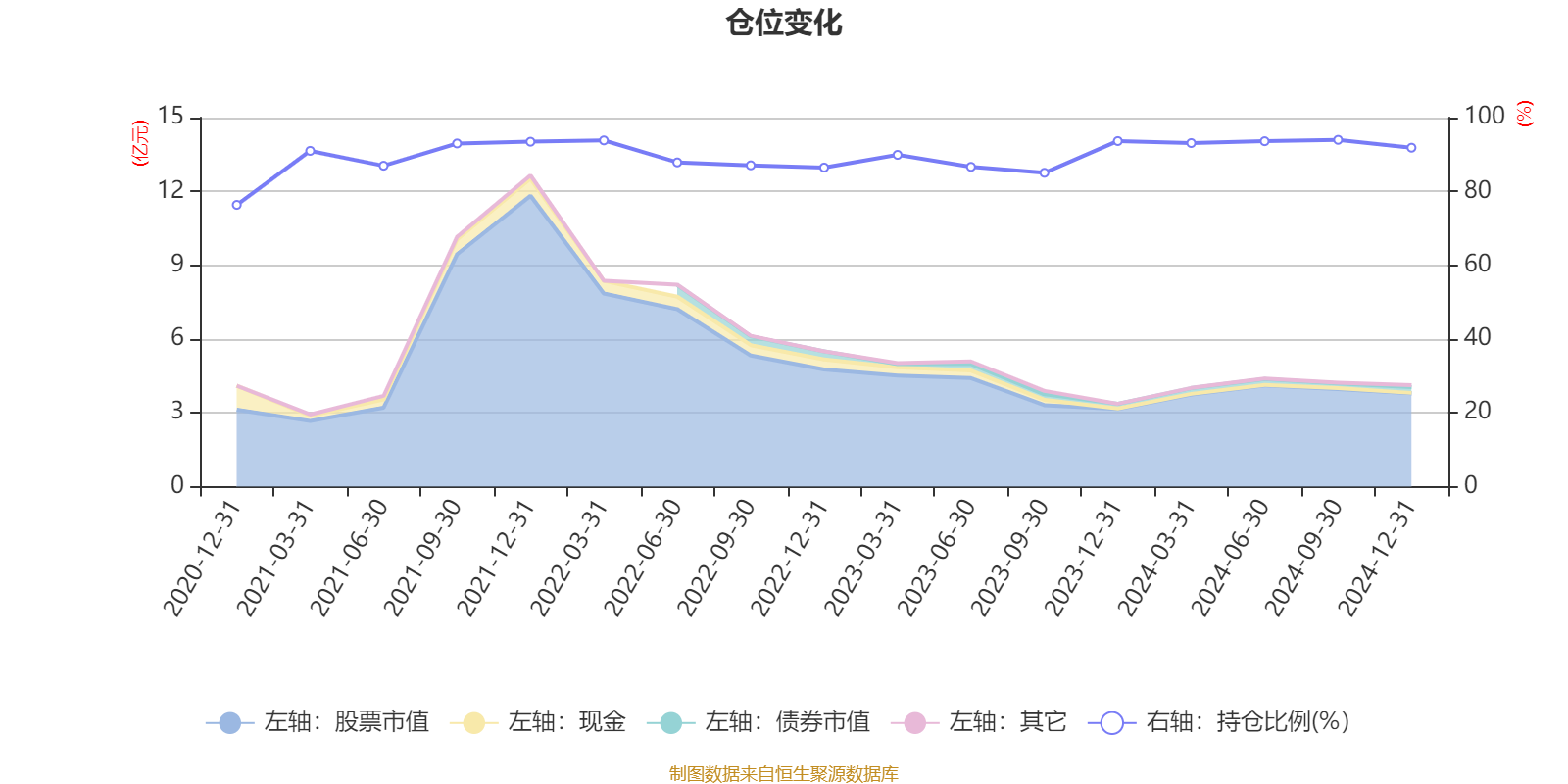 据定期报告数据统计,近三年平均股票仓位为90.25%,同类平均为84.97%。2024年三季度末基金达到93.97%的最高仓位,2020年末最低,为76.35%。